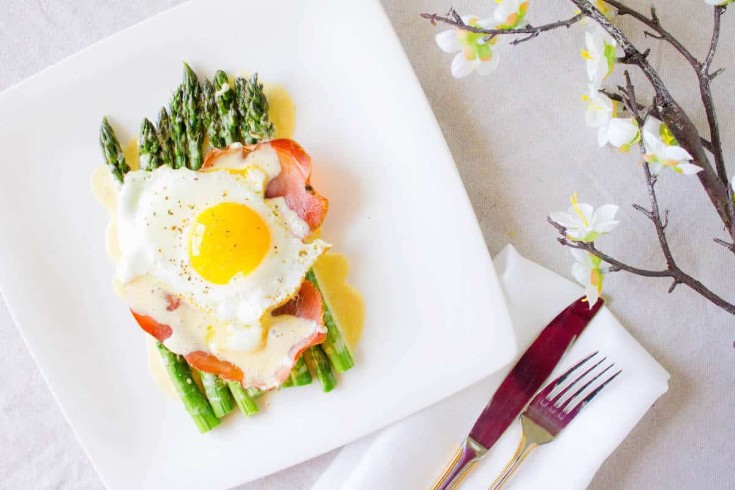 - To assemble, transfer the asparagus to your plate. Place the prosciutto on the bed of asparagus, top with the fried egg and the hollandaise sauce.