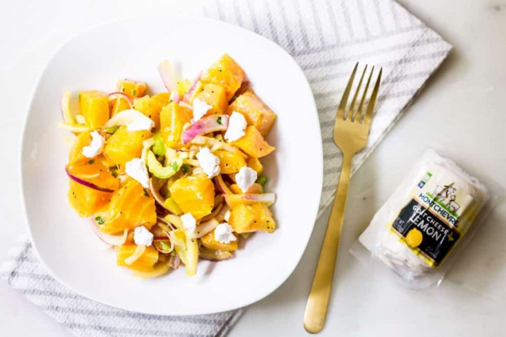 To create this colorful fresh beet salad recipe, I used golden beets, fennel, red onion, celery, and Montchevre goat cheese. If you’ve never tried Montchevre’s goat cheese, I highly recommend you do.