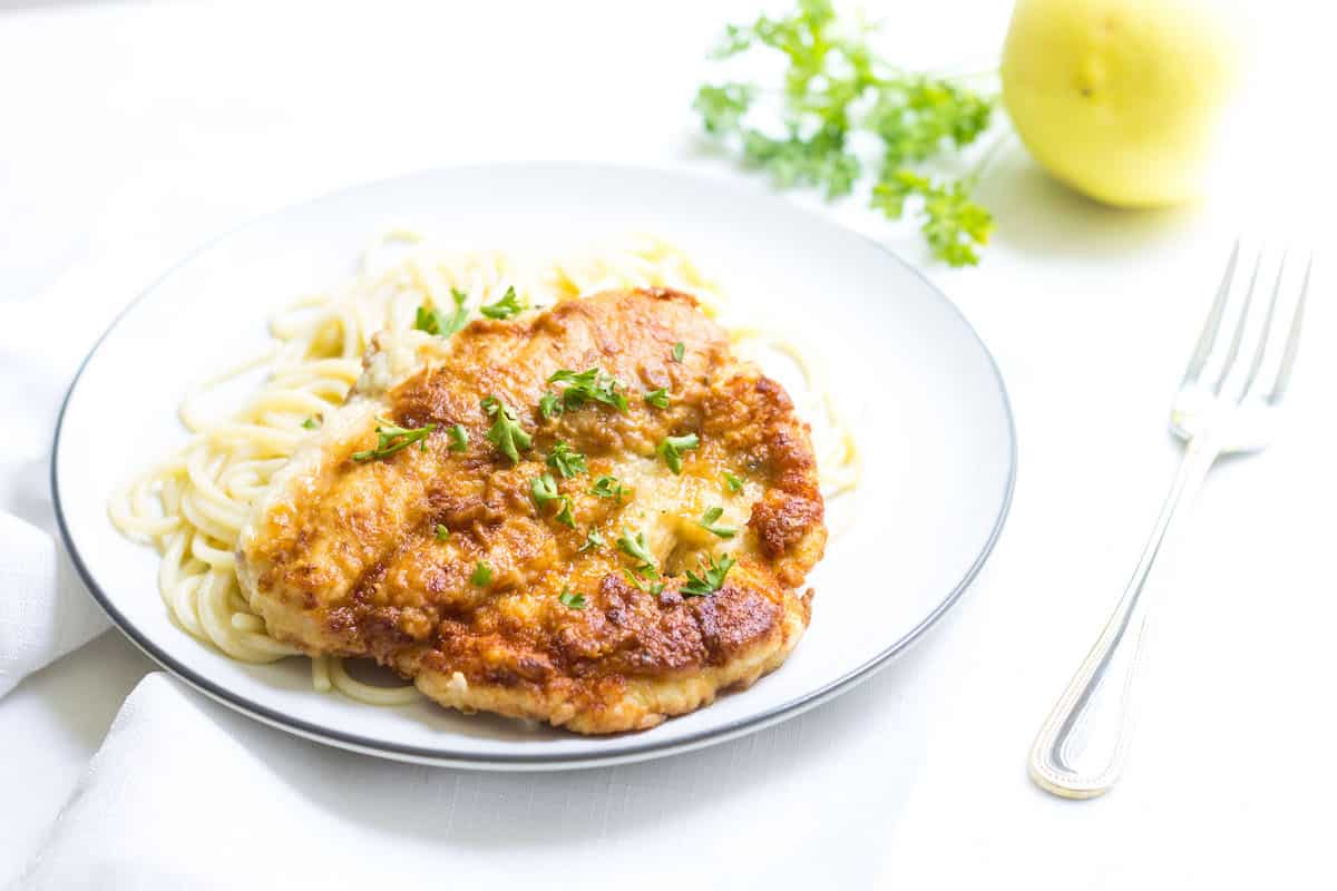 Chicken dredged in flour and fried, then topped with a delicious lemon-butter sauce.