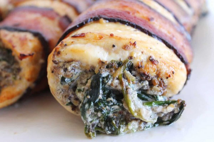 Chicken stuffed with spinach, mushrooms, and ricotta, then wrapped in bacon.