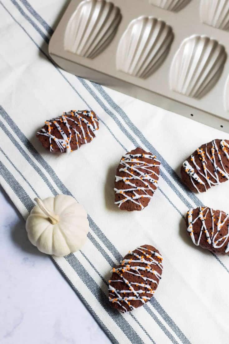 Traditionally, madeleines have been dipped in milk chocolate or dark chocolate, or dusted with powdered sugar. I wanted to add some color contrast to my chocolate madeleines, so I drizzled some white chocolate on them instead, then added black and orange sprinkles for a festive, Halloween look.
