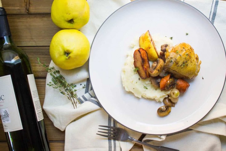A classic French chicken stew cooked with red wine and a seasonal twist of quince.