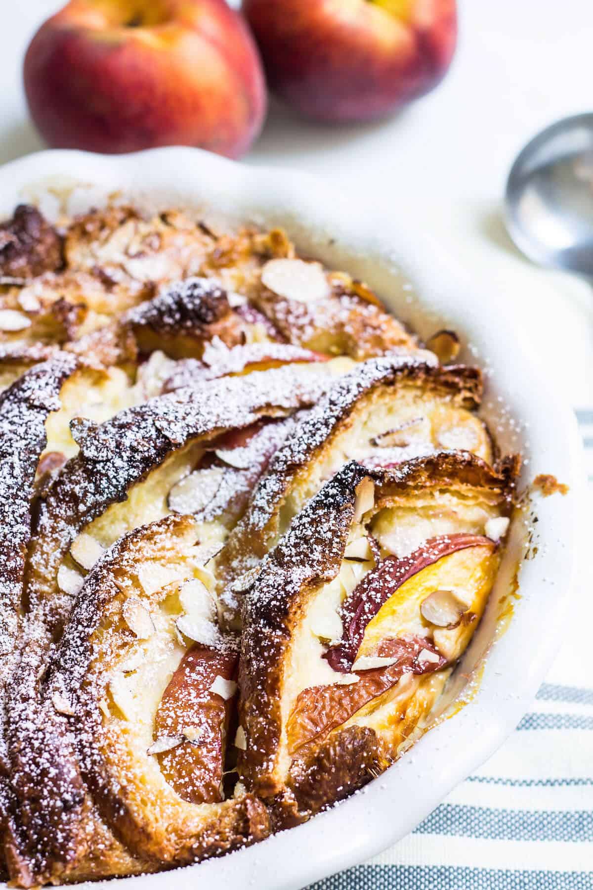 Crisp, buttery croissants bathed in a custard batter with sweet peach slices nestled in-between.