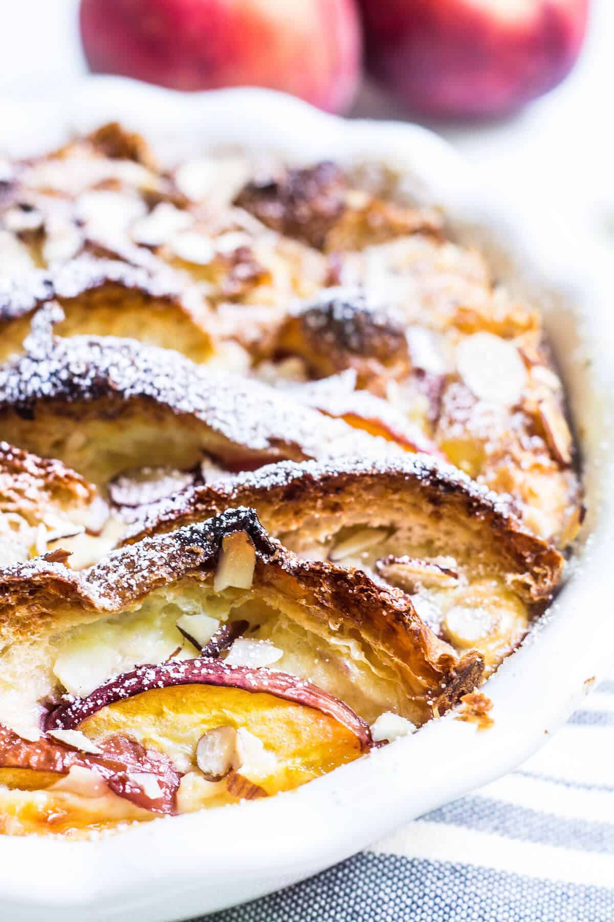 They down this pudding as soon as the plate reaches their hands. This croissant bread pudding is made with sliced bakery croissants, sliced fresh peaches, a quick custard batter, and sliced almonds.