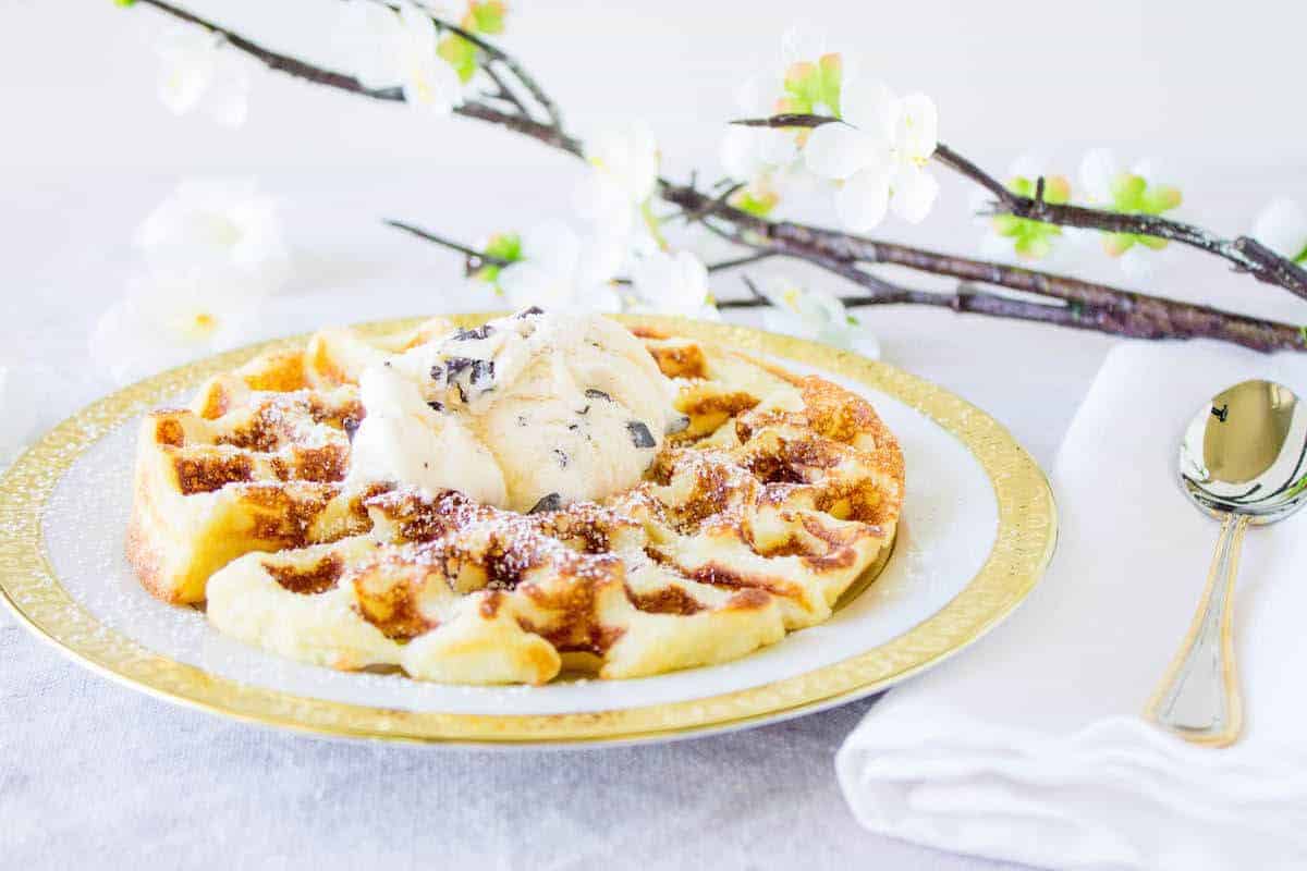 While classic waffles are great, there’s just something amazing about a yeast waffle. When you’re making the batter for these, you’ll probably be thinking it’s really thin and soup-y, nothing like the breads you’re used to making yeast with. And you’d be right, this is nothing like a bread. The yeast in this batter contributes in two ways. Firstly, it provide lots of flavor. When these waffles cook inside the waffle iron, it will smell like you’re baking the most wonderful bread ever. That’s all because of the yeast. Secondly, the yeast gives the waffles that sort of “raised” appearance, and just the overall fluffy texture. The outside gets nice and crisp, while the insides remain light and airy. If you want to do it the French way, dust the warm waffles with powdered sugar and top with a scoop of your favorite ice cream. This is the stuff dreams are made of.
