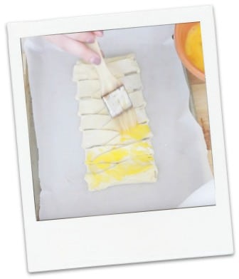 - Grab one diagonal strip of puff pastry from one side and bring it up and over the filling. Grab a strip from the opposite side and bring it up and over the filling. Continue to "braid" the pastry down to the bottom. When you reach the last pieces, tuck the edges under the entire pastry braid to keep the braid pinched shut.