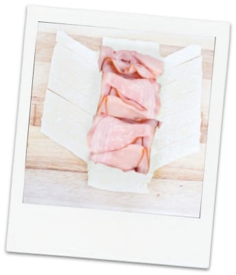 - Spread a thin layer of honey dijon mustard in the center of the puff pastry, in a straight, vertical column (making sure to leave a 1.5" gap between where the mustard is and where the edge of the puff pastry is - so top and bottom of this dijon column should be clear). If you're using a store-bought sheet of puff pastry, you should spread the dijon where the center fold is, leaving the top and bottom of the pastry's center fold bare. Layer slices of the ham over the dijon, again leaving the top and bottom areas bare. Follow with the slices of cheese, trimming the cheese if needed.