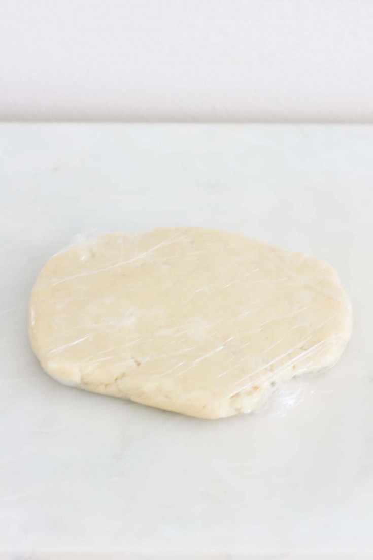 - Turn the dough out onto a sheet of plastic wrap. Use your hands to mold the dough into one large mass. Wrap the dough, then use the palm of your hand to flatten it out into a large disc. Refrigerate the dough for 30 minutes.