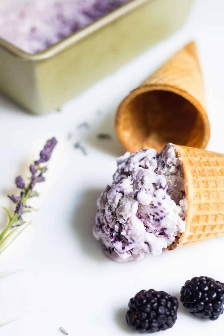 The blackberries in this recipe give this lavender ice cream their wonderful purple hue, while adding a little blackberry flavor and texture. I like the speckled look of the ice cream from the blackberries as well.
