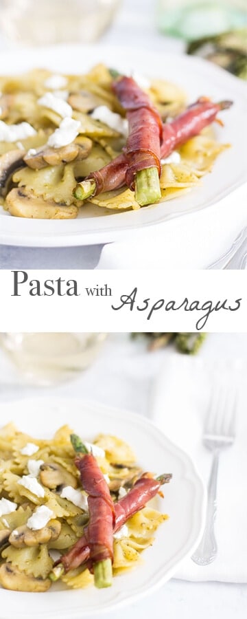 - Before serving, garnish pasta with crumbled chevre and the prosciutto-wrapped asparagus.