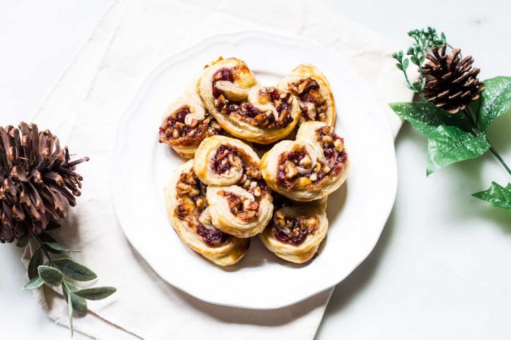 Savory palmiers made with Puff Pastry, brie, cranberry jelly, and chopped walnuts.