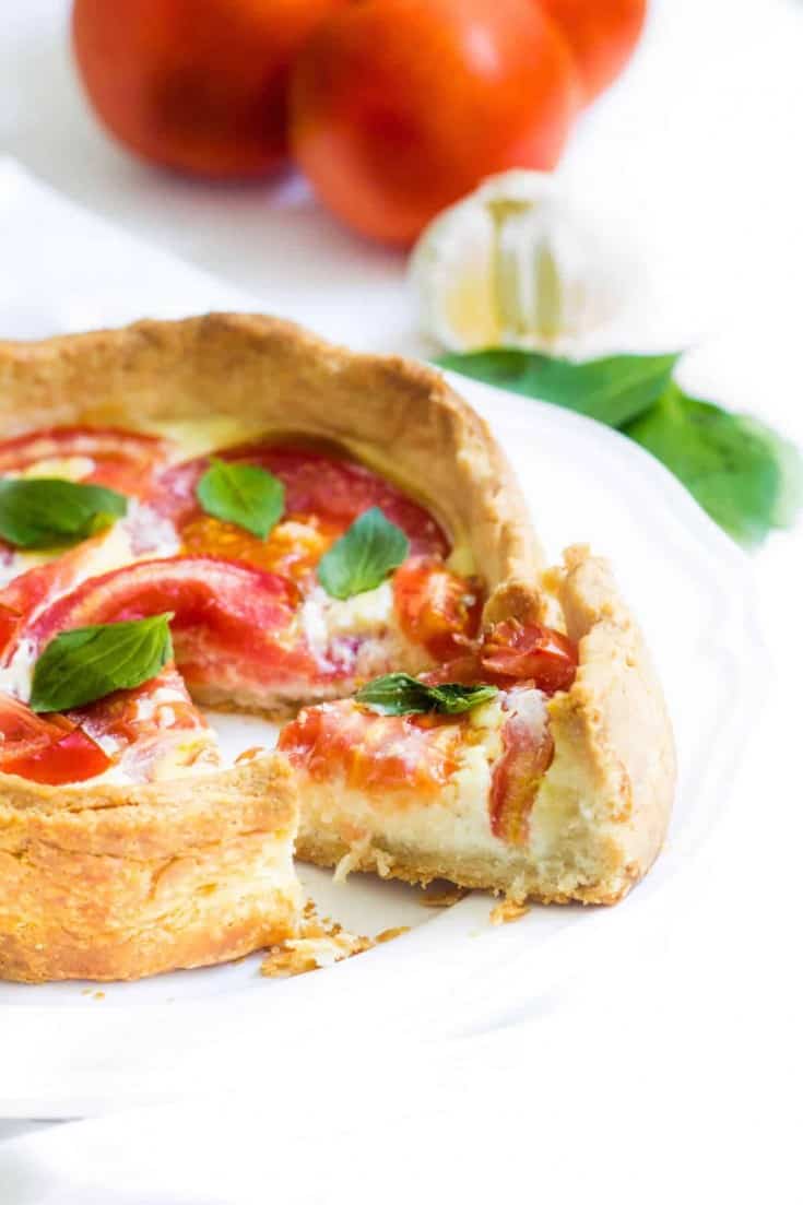 The tomato slices are placed on top of the cheese filling and baked until they’re tender. A quick grind of sea salt and some fresh basil leaves are all this tart needs to make it absolutely mouthwatering!